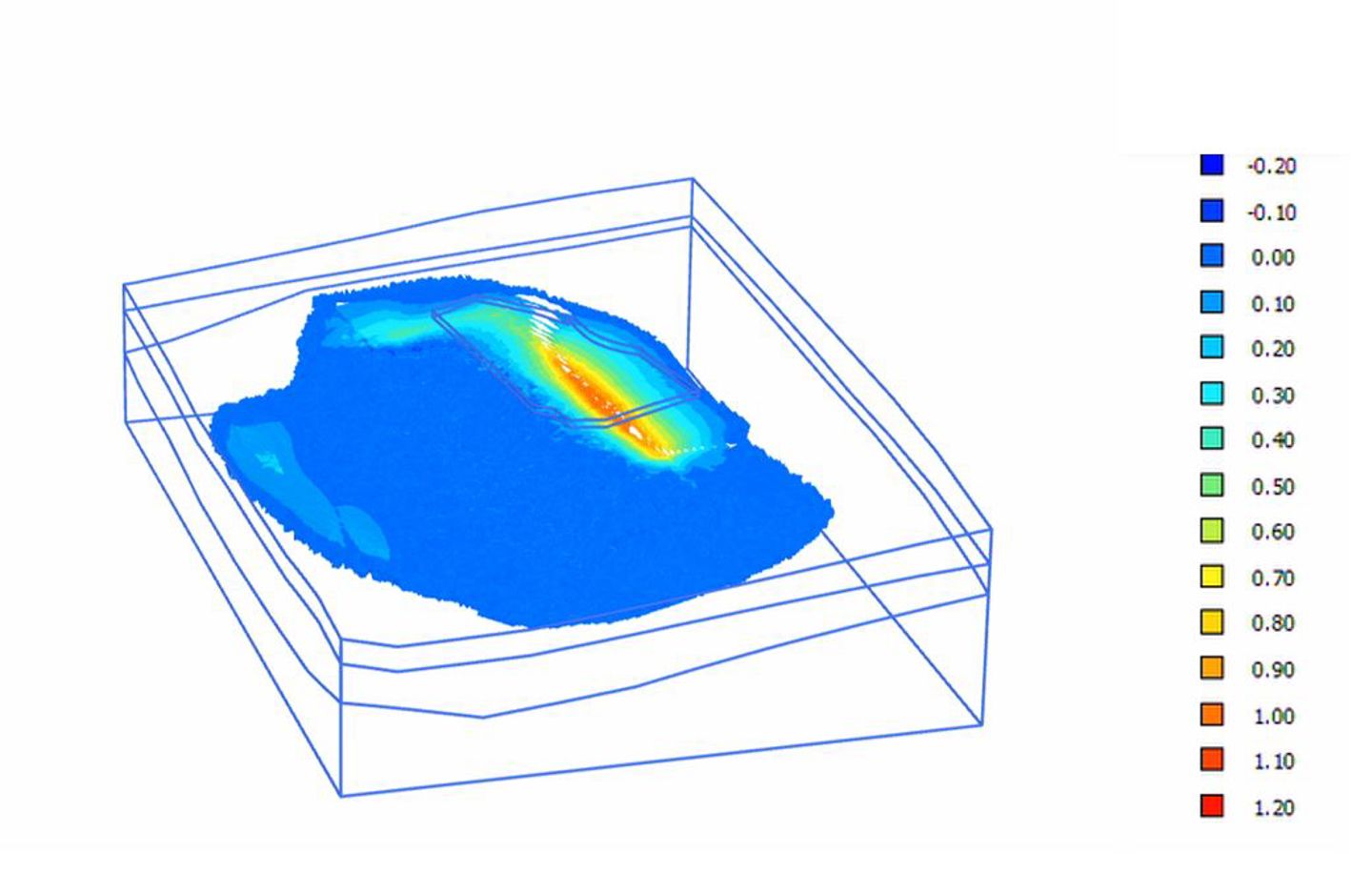 However, such analyses in a lot of scenarios have led to spurious SF values even for failed slopes which as per definition should have a SF value below 1.0. The ill-estimation of the safety factor using a 2D framework of analyses amongst other factors could be due to the method's incapability to account for 3D effects and strain-softening in sensitive materials. This project plans to investigate strain-softening effect in a 3D domain on the computed SF by comparing results of 2D and 3D calculations for a model slope. The outcomes of the approach will be validated against 3D-analyses of the 2015 Skjeggestad bridge slope failure. The goal of the project is to provide recommendations on the choice of 3D or 2D modelling of slopes. The recommendations would try to encompass scenarios under which 3D effects would be dominant and would lead to unreliable SF predictions with 2D modelling.